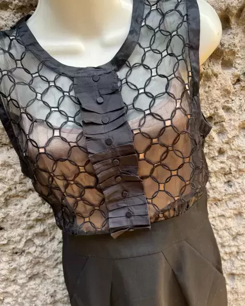 Vestido de fiesta. Lindo vestido de fiesta elegante en color negro con transparencias la parte de arriba y trae una blusita en color oro abajo mide de axila a axila 43cm se usó dos veces en perfecto estado sin detalles
