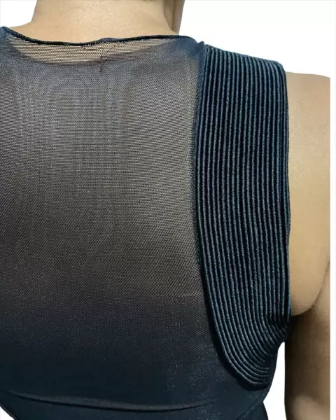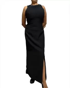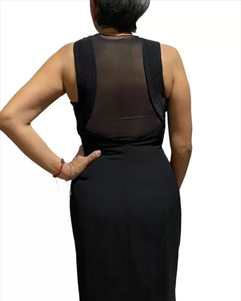Vestido largo color negro con escote en la espalda con mallita y avertura en la parte de atrás Sin detalles.