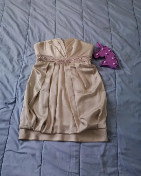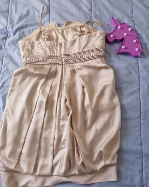 Vestido corto satinado tipo globo, talla M con aplicaciones al frente, corte straplessMedidas : axila 46cm cintura 40cm largo 54cm