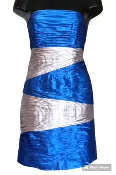 VESTIDO METALICO AZUL/PLATA, SOLO TIENE UN DETALLE EN EL FORRO QUE SE DECOLORÓ EL FORRO DE LA PARTE SUPERIOR PERO ES INTERIOR (FOTO 4), POR LO DEMÁS ESTÁ IMPECABLEBUSTO 94CINTURA 80CADERA 88LARGO 71