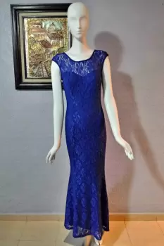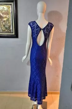 Vestido de fiesta azul rey. Vestido largo de fiesta color azul rey, de encaje tela ajustable, con escote en espalda, Talla -M