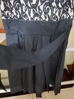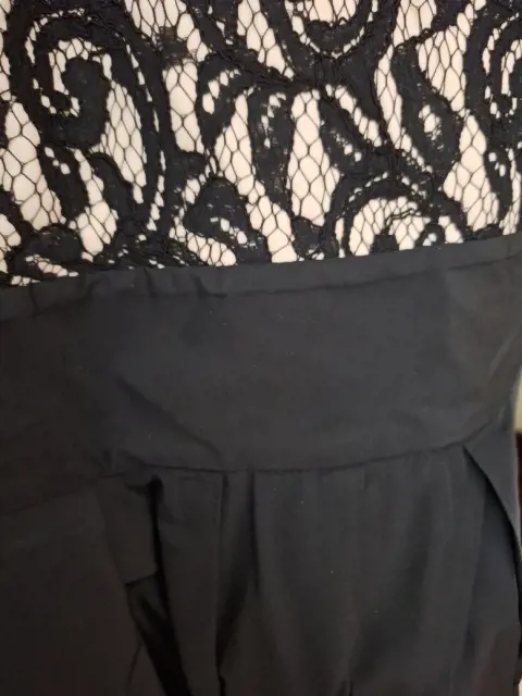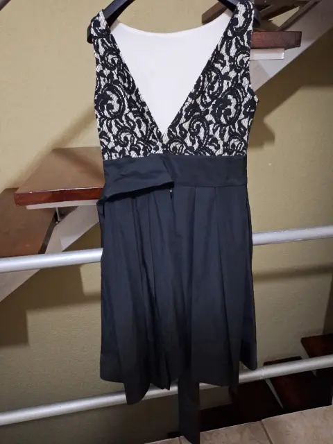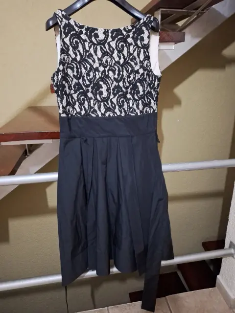 Vestido de fiesta, faldón con tablas en color negro en tarjeta, con pretina ancha en cintura con cinta para ajustarse y elaborar moño, con bolsas ocultas, el fondo del top es beige con encaje en negro, escote al frente es tipo oval y escote trasero en V, del largo aproximado tipo Midi para una persona de 1.60 mts, sin forro y no lo requiere por el tipo y calidad de la tela. Es elegante y da muy bonita figura además super como. Composición 100% poliester