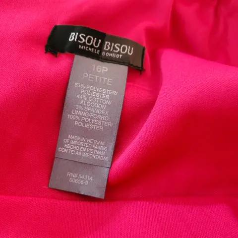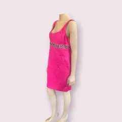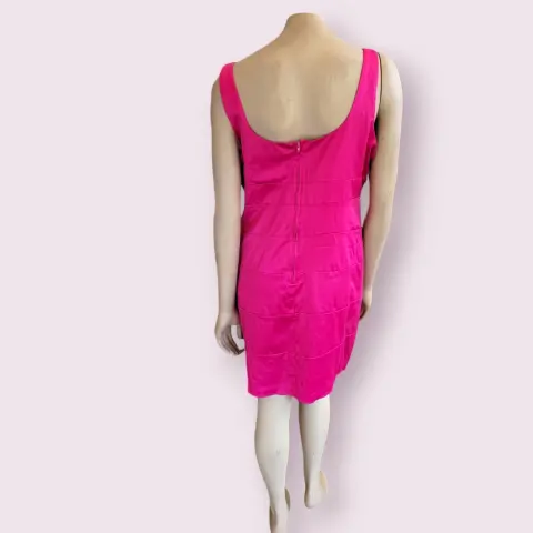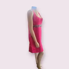 Vestido de Fiesta Bisou Bisou, talla XL, color rosa Fiusha con detalles de chaquira y liston brillante en colores cafe y beige al frente, mangas de espagueti ancho, escote redondo semiacolchonado bajo, plegado en pecho para mayor contour, cierre atras, detalle de costuras a lo ancho del vestido, forrado por dentro, hecho de poliéster, algodón y espandex, mide 42cm de hombro a hombro, 90cm de largo