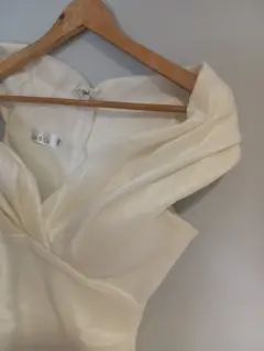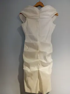 Vestido corto de fiesta en color blanco, con hombros caídos la tela es brillante y elástica, tiene drapeado en la parte trasera y en el busto, marca Lu&Co