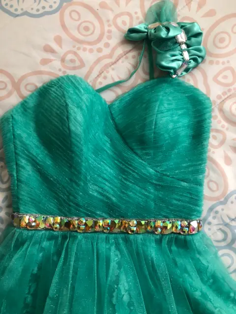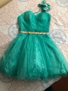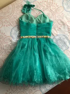 Vestido de fiesta color menta. Ideal para jovencita graduación o fiestaAdorno en el hombroAplicaciones imitación piedras en la cintura Doble forro que da seguridad( no se transparenta)MedidasAxila 36 cmCintura 32 cmLargo71 cm