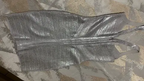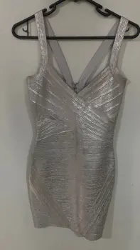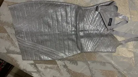 Vestido de fiesta color plata. Bonito vestido de fiesta, en color plata tipo de tela licra talla S marca bebé acomoda súper bonito estilizando el cuerpo