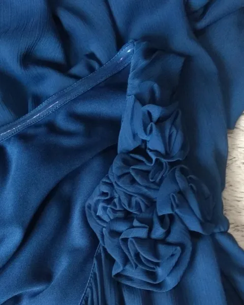Vestido de fiesta con flor!🌺. Lindo y tierno vestido corto azúl marino intenso, con un hombro descubierto, trae unas pequeñas flores de la misma tela en unos de los hombros, trae forro, con la elástico abajo del busto, es sueltito, con cierre al costado. Se ve súper hermoso con zapatillas plateadas. Es talla S, pero queda perfecto a M 💖