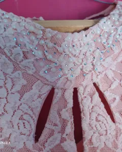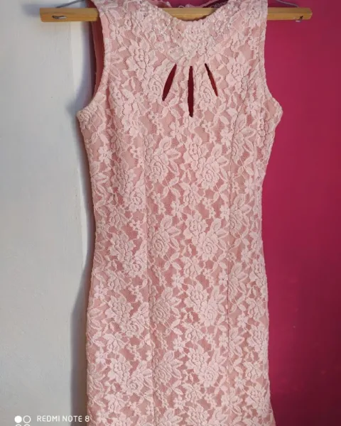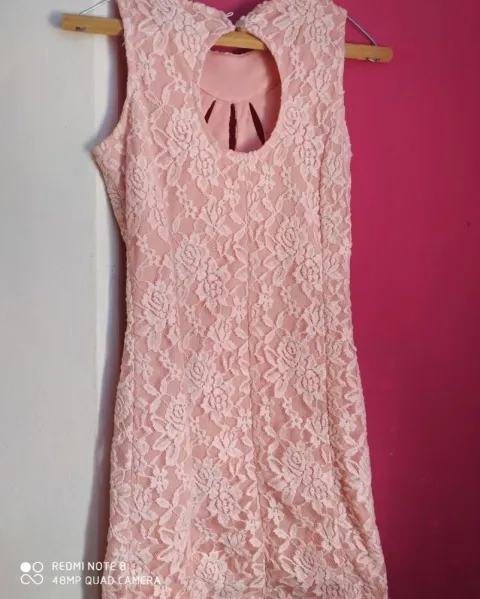 Vestido coral muy bonito, con abertura en la parte de atras y detalles de perlas en el cuello, estilo de encaje en rosas.Único detalle le hace falta un boton