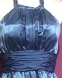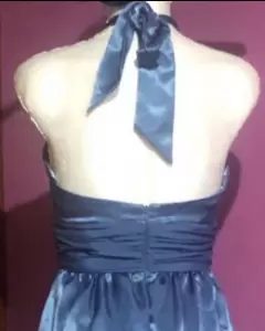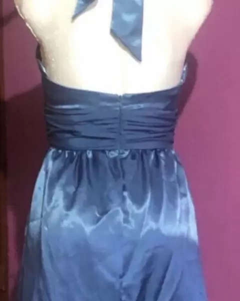 Bonito vestido en tela satén, sin espalda, cuello halter, tiene tipo pretina en la cintura, cierre oculto y cintas para amarrar.