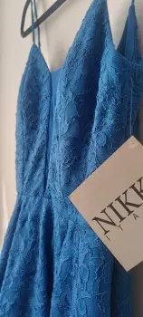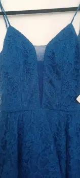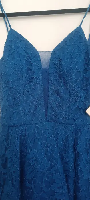 Vestido completamente nuevo de fiesta color azul, sin detalles tiene etiqueta, está nuevo, con transparencia en la parte del escote y esponja en la parte del pecho, tiene crinolina para darle vuelo a la falda. Talla s-m