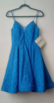 Vestido de fiesta corto azul. Vestido completamente nuevo de fiesta color azul, sin detalles tiene etiqueta, está nuevo, con transparencia en la parte del escote y esponja en la parte del pecho, tiene crinolina para darle vuelo a la falda. Talla s-m