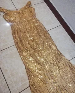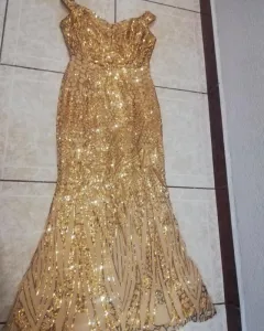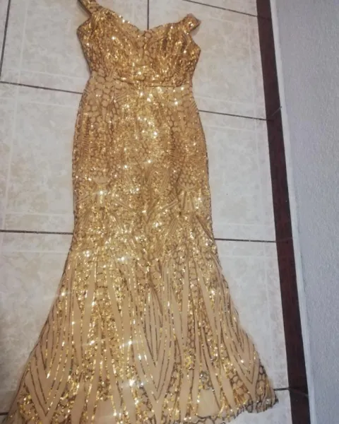 Color dorado con lentejuela, estraples, forma sirena, largo y se ajusta bonito