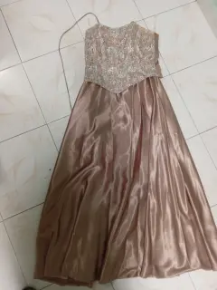 Vestido de fiesta elegante largo dorado satinado talla 7 en buenas condiciones