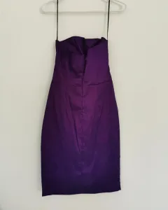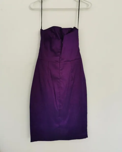 Vestido de tela tipo raso stretch. Color morado. Strapless. Con tablones en la cintura al frente y una flor de tela. Siper a la espalda. Talla S.