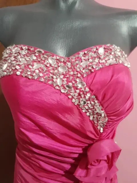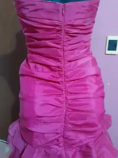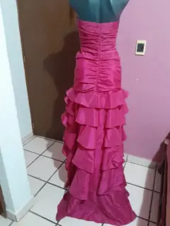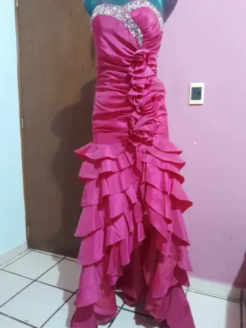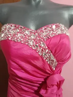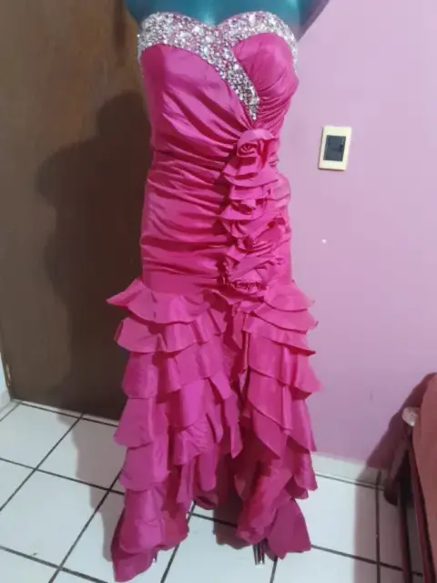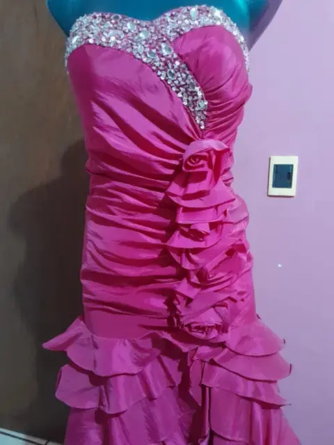 Vestido de fiesta elegante color fucsia. Usado una sola vez, talla extra chica, vestido de fiesta un poco más corto en la parte de frente y largo en la parte de atrás, olanes y flores, detalle de pedrería en el escote strapless de corazón.
