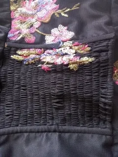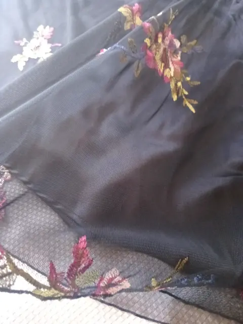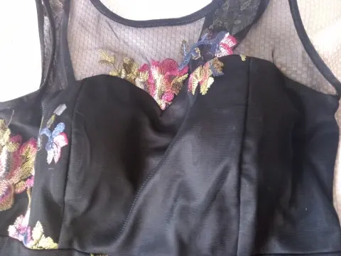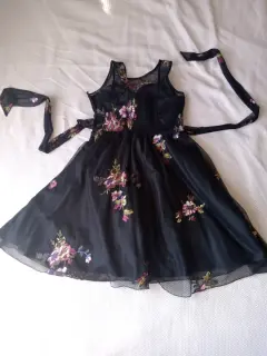 Vestido de fiesta, flores bordadas. Vestido corto de fiesta, talla XL para adolescente, se ajusta x detrás y tiene moño. Amplio. Largo de blusa 34 CM. Largo de falda 55 CM. De cintura mide 72 cm