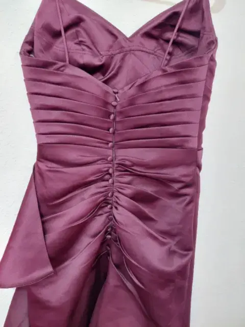 Hermoso vestido largo straple color morado ,es de cierre atrás y tiene de decoración botones,sus planes hacen que se te haga una figura divina es talla 10 queda a M muy bien