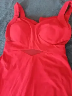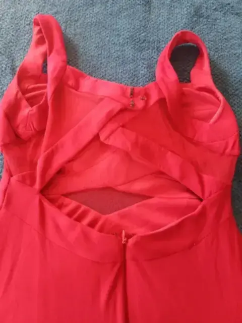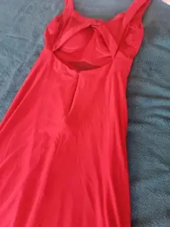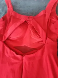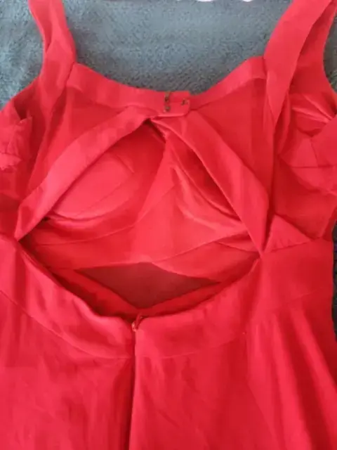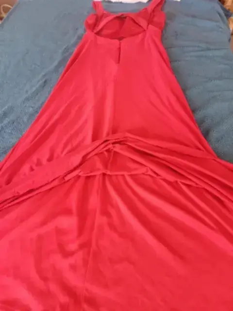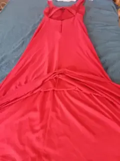 Vestido largo de fiesta, rojo, con forro, copas, detalle transparente debajo del pecho y espalda semi descubierta, hermoso e impecable. Dama Petite, talla CH