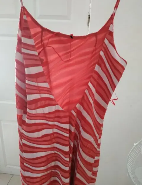 Vestido largo color coral (rayado)-La tela es 60% Rayon y 40% Poliéster.-De la parte de atras es un poco abierto en V-Su forro es 100% Poliéster-La talla es 14/34 (puede que le quede a una talla CH o M)-Este vestido me recuerda a un caramelo e igual puesto se ve súper elegante a quien lo porte 🤭