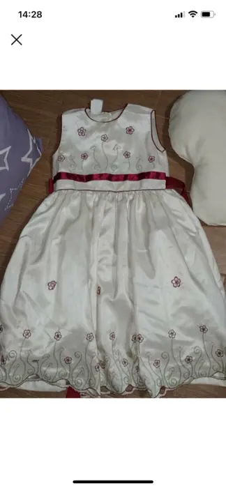 Precioso vestido color beige/ vino talla 4 años con detalles bordados en la parte de abajo escotado en hombros y cinta trasera para mejor ajuste te regalo el abriguito