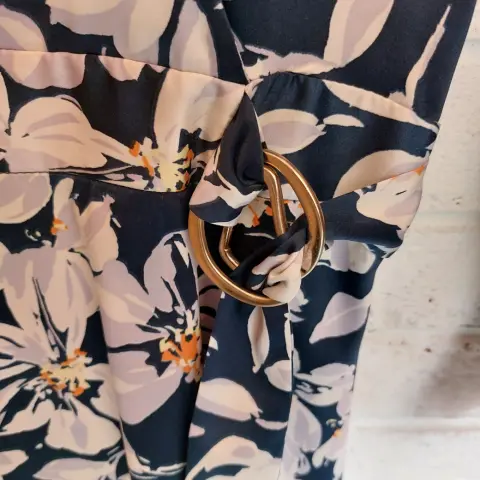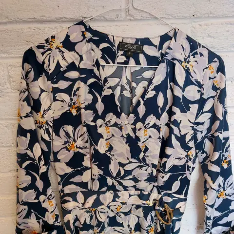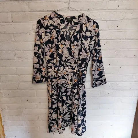 Vestido de flores blancas con azulAcinturado con cinturón y hebillasArriba de la rodillaTela suaveTalla 4Puesto una vez