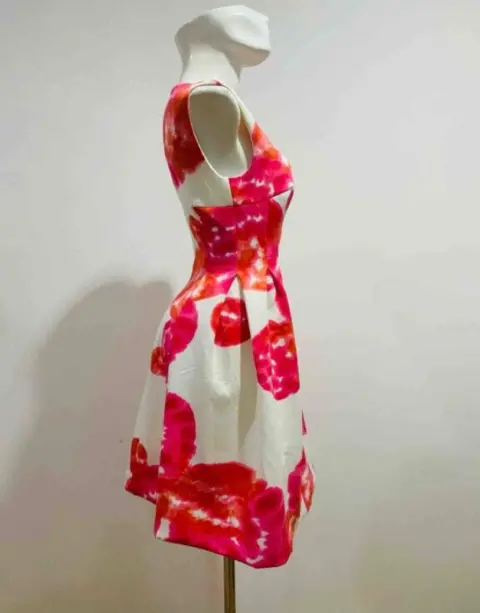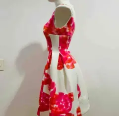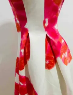 Vestido de flores rosas. Tela strech gruesa con forro. Falda con tablones. En la bastilla tiene por dentro una tela gruesa que hace se vea hampon. Mide de sisa a sisa 45 cms. De cintura 34 cms. De largo 92 cms.