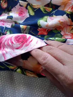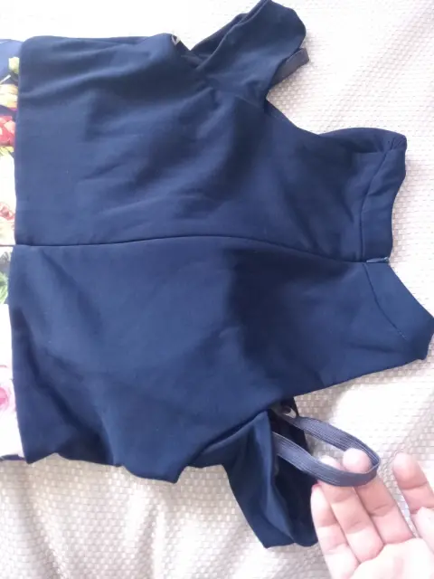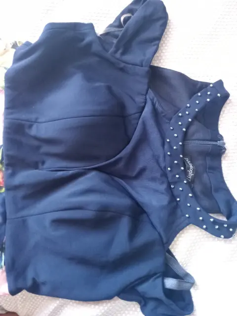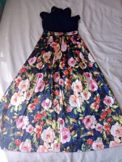 Vestido de gala. Vestido largo azul y floreado. La tela se ajusta al cuerpo. Talla mediana. De cintura mide 72 CM. De largo la blusa mide 32 CM y la falda 102 CM. Tiene fondo y también el área del pecho tiene para acomodar las bubis. Tiene bolsillos a los costados para guardar el celular
