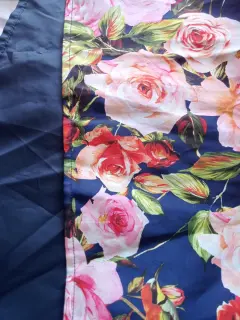 Vestido largo azul y floreado. La tela se ajusta al cuerpo. Talla mediana. De cintura mide 72 CM. De largo la blusa mide 32 CM y la falda 102 CM. Tiene fondo y también el área del pecho tiene para acomodar las bubis. Tiene bolsillos a los costados para guardar el celular