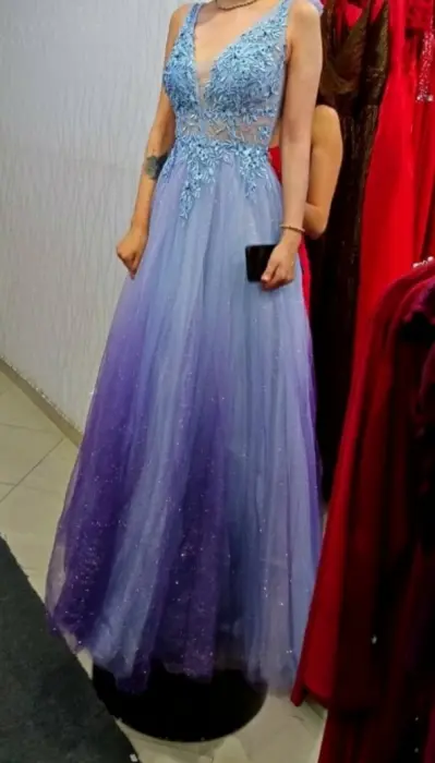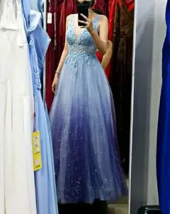 Lo amo! Lo usé para mi graduación, pero sé que no lo volveré a usar, así que espero que alguien más pueda hacerlo🤭Talla: SBusto: 80cm (copa 34B)Cintura: 66cmLargo: 140cm-Tiene efecto degradado va de azul a morado🤩-En la parte del tul viene un poco desgarrada la primera capa, pero igual se puede arreglar -Tiene lentejuelas y pedrería alrededor-Es corte tipo princesa 👸🏻