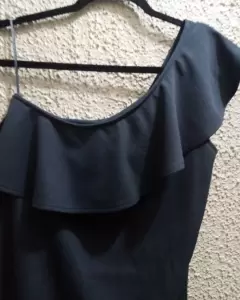 Vestido de hombro descubierto con olas en la parte superior es entre azulado y gris, trae forro No tiene detalles.