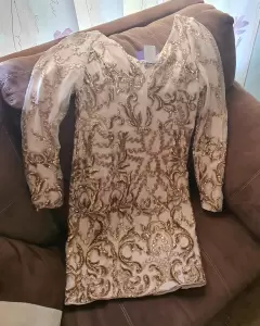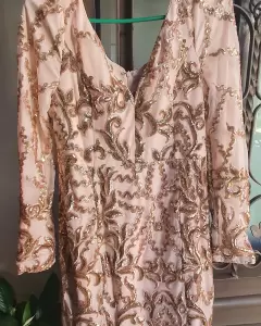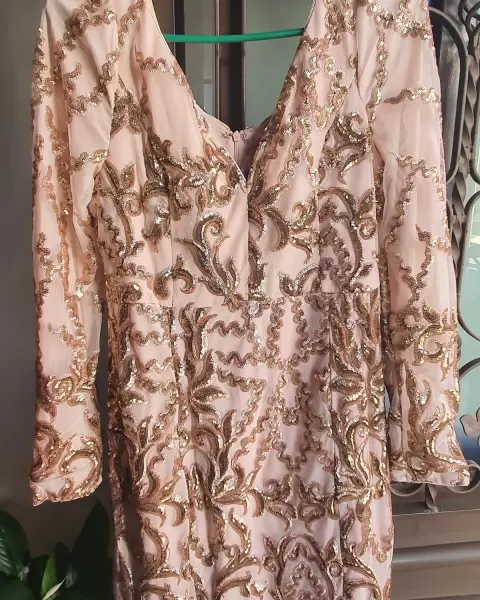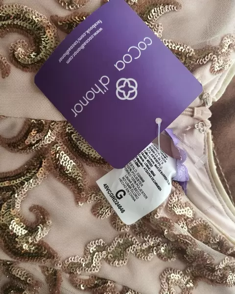 Bonito vestido de fiesta en tono nude con diseños en lentejuela color rose gold, totalmente nuevo solo arrugado de estar guardado, marca coCoa d'honor
