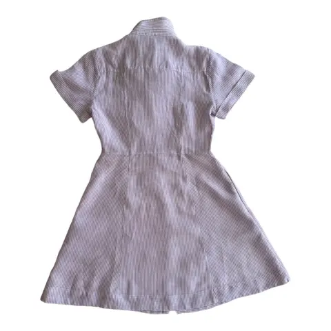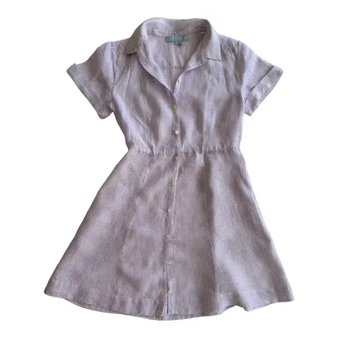 Vestido de lino a rayas. Vestido de lino a rayas blancas con lila, se abotona al frente y tiene bolsillos laterales.No estira.Talla: XS