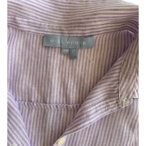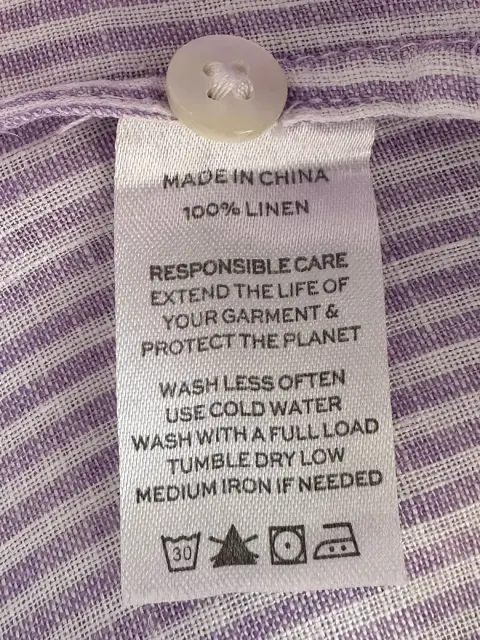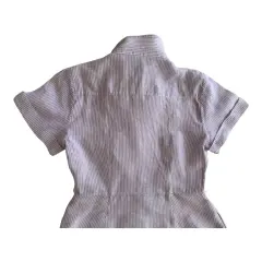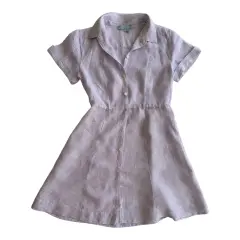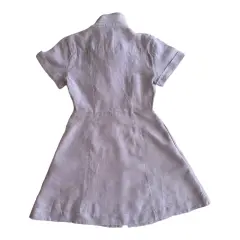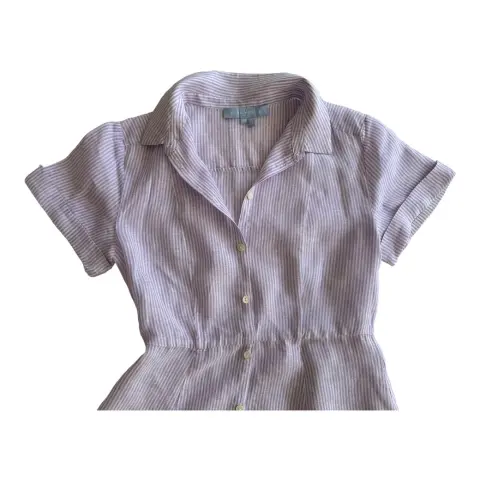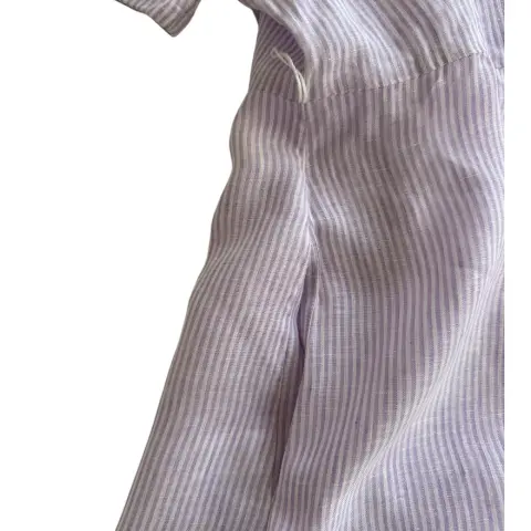 Vestido de lino a rayas blancas con lila, se abotona al frente y tiene bolsillos laterales.No estira.Talla: XS