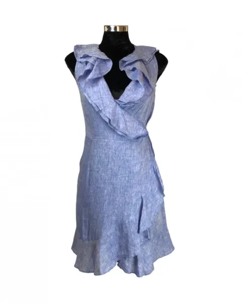 Vestido de lino Calvin Klein. Vestido en tela tipo lino azul jaspe con bellisimos detalles ondulados en en frente y a lo largo del vestido, es talla 2 o S de Calvin Klein.
