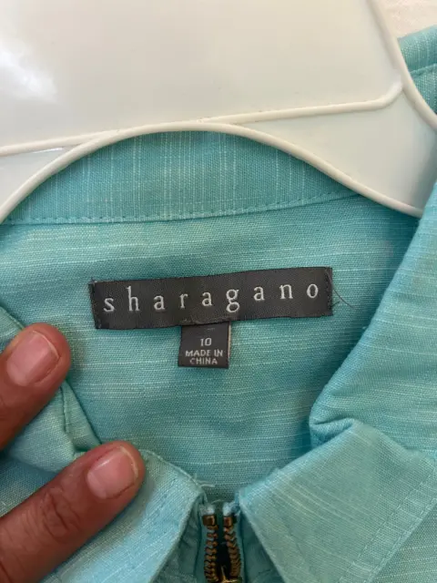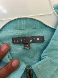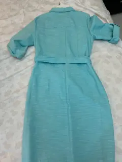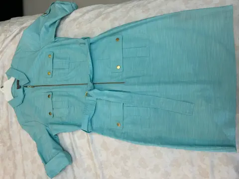 Vestido color verde agua detalles de botones dorados cinturón. De la misma tela pero evillq dorada, largo dejado de la rodilla.