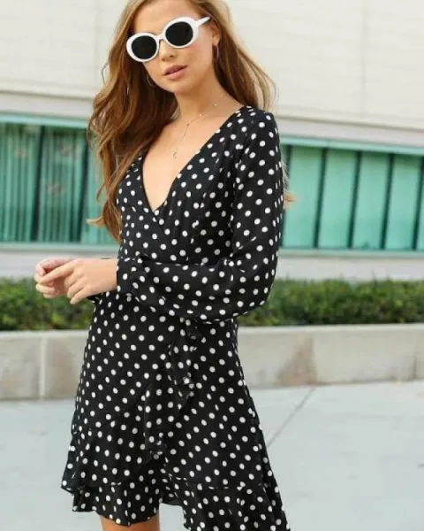 Vestido de lunares OLD NAVY negro con blanco cuello en V Con botones manga 3/4 con campana y elastico en cintura