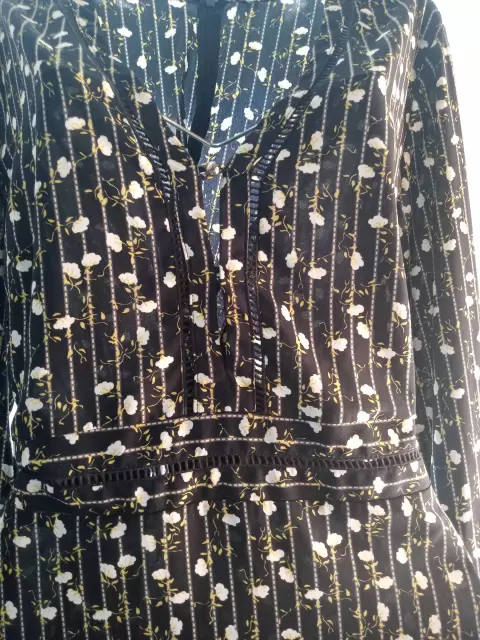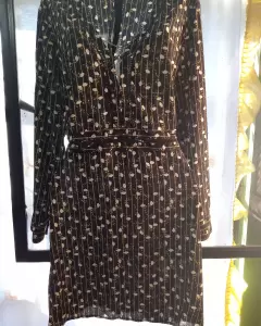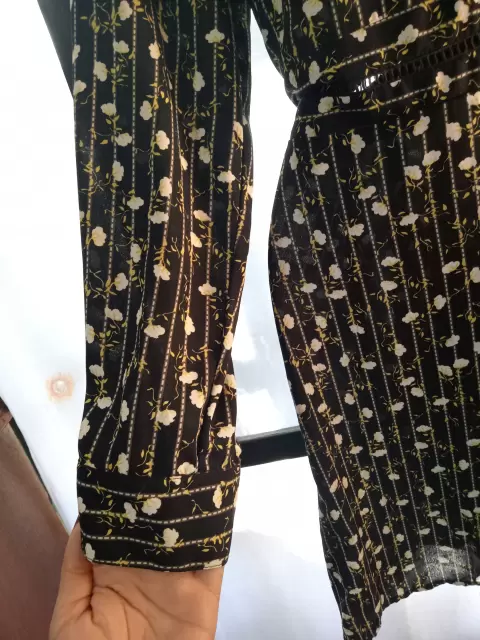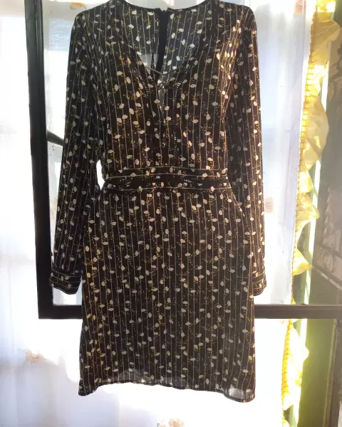 Precioso y coqueto vestido de manga larga, base de color negro con flores amarillas y blancas, tiene un diseño en la parte de la cintura y el pecho que deja ver un poquito de piel 🥰❤️❤️💅