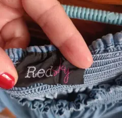 Vestido de Mezclilla. Hermoso vestido de mezclilla delgada, con delicado bordado de flores al frente y hombros descubiertos