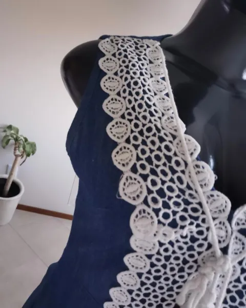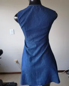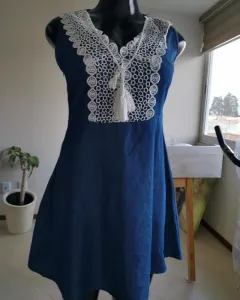 Vestido de mezclilla. Vestido de mezclilla, con encaje en Busto, escote en V, cierre a un costado y queda a media pierna