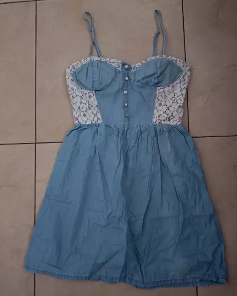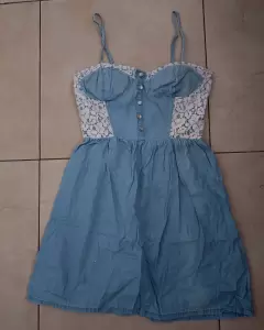Vestido de mezclilla con encaje. Vestido de mezclilla con aplicación de encaje, talla mediana de forever 21