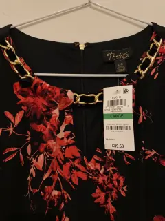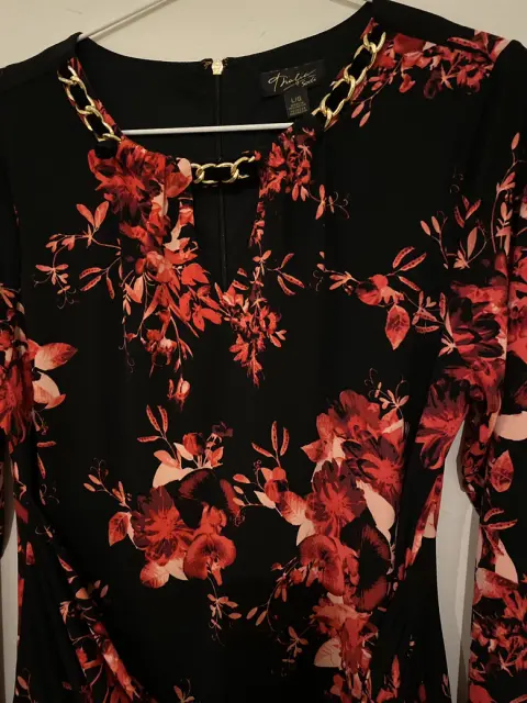 Vestido de mujer talla L es nuevo con etiqueta de color fondo negro y estampando en rojo arma muy bonito por el detalle de la cintura disimula la pancita el largo es abajo de la rodilla en el cuello tiene como un collar queda muy bonito excelente vestido casual
