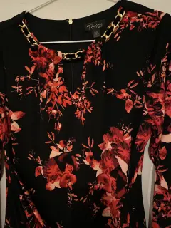 Vestido de mujer de Thalía sodi. Vestido de mujer talla L es nuevo con etiqueta de color fondo negro y estampando en rojo arma muy bonito por el detalle de la cintura disimula la pancita el largo es abajo de la rodilla en el cuello tiene como un collar queda muy bonito excelente vestido casual