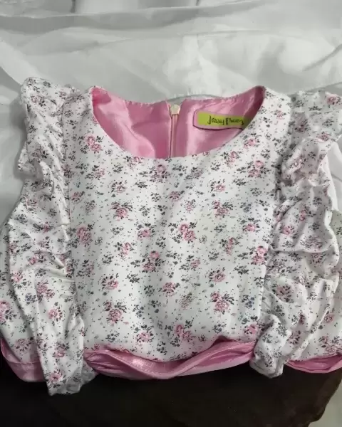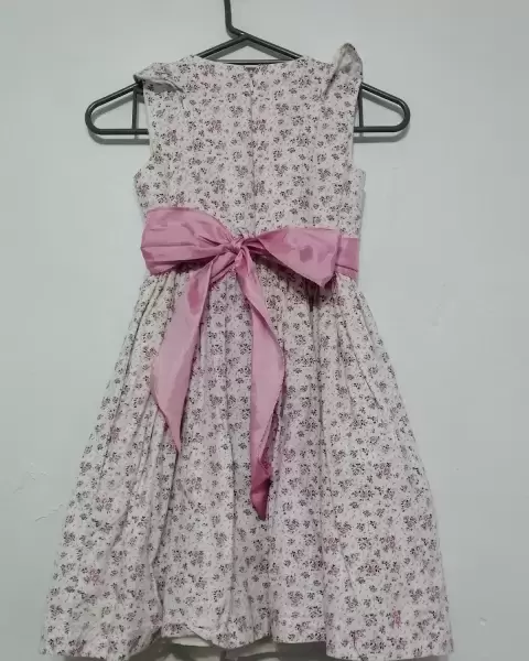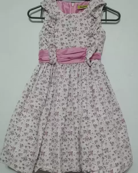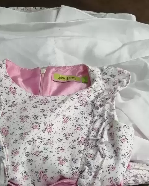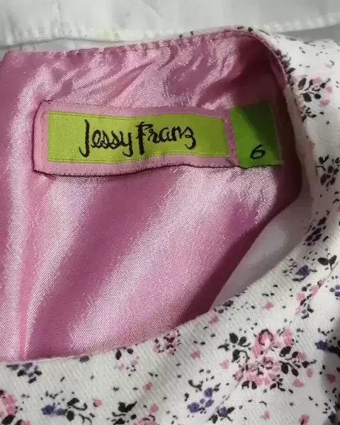 Hermoiso vestidito Jessy Franz de color blanco con flores en tonos rosa, pliegues y ajuste a la cintura.Con hermoso listón rosa y pliegues tipo olan en el peto, tiene doble vuelo gracias a su forro doble.Talla 6 de niñas