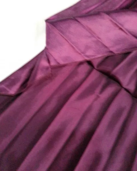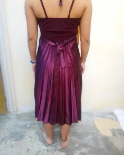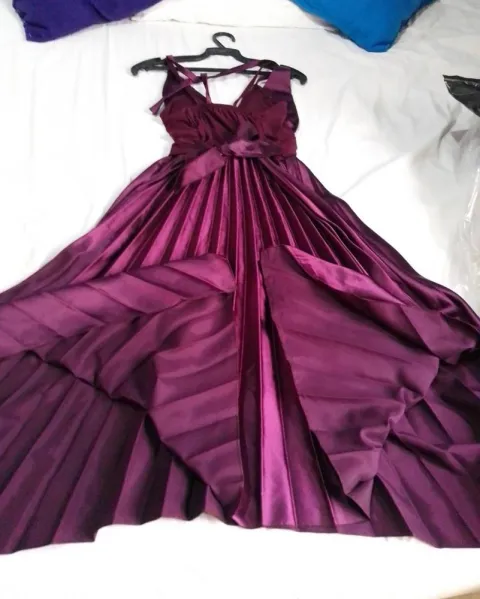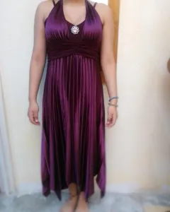 Vestido de noche color morado con plieges en la caida además tiene un broche en la parte a arriba cinta para atar, en la parte de abajo hay una pequeña descosida del lado inferior izquierdo