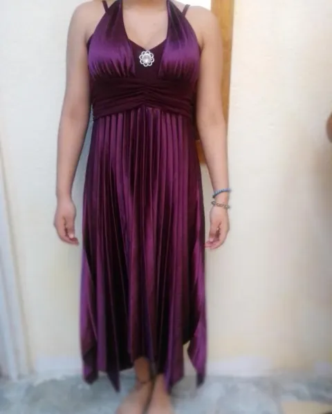 Vestido de noche. Vestido de noche color morado con plieges en la caida además tiene un broche en la parte a arriba cinta para atar, en la parte de abajo hay una pequeña descosida del lado inferior izquierdo