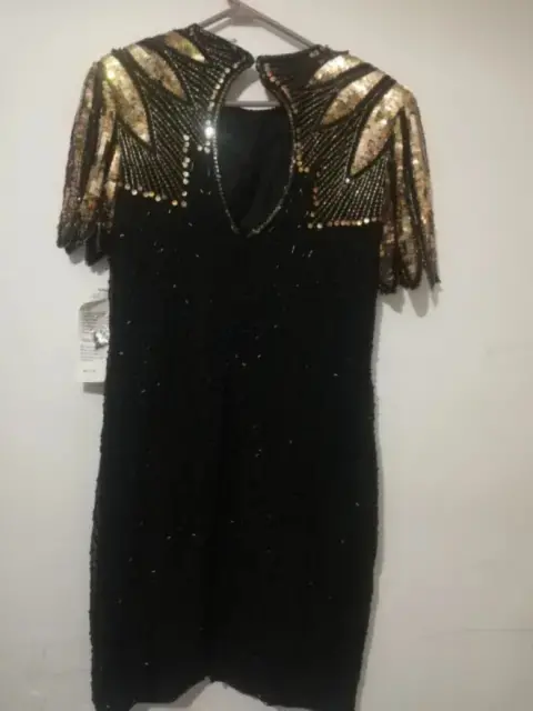 Vestido de noche corto, chaquira nuevo, aplicaciones en color oro, en perfectas condiciones