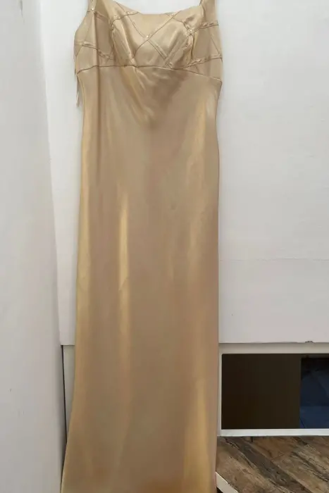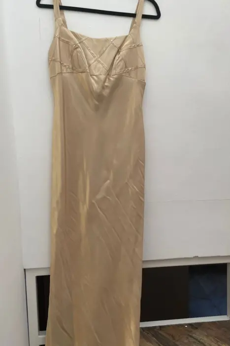 Vestido de noche, color dorado, Marca Franca, aunque la talla aparece como XL es una talla 12. Vestido de noche.