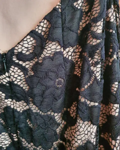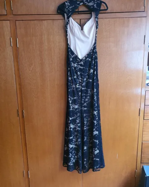 Vestido de noche. Vestido largo de noche fondo color nude y encaje floreado color negro, espalda descubierta tipo óvalo