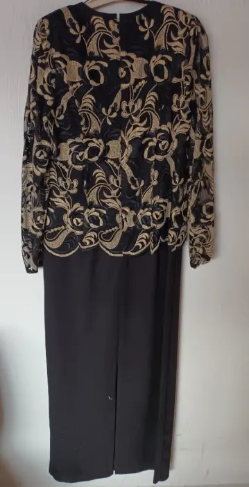 Vestido de noche. Bonito vestido de noche largo con manga. La falda es negra y la blusa negra con dorado. Usado dos veces.