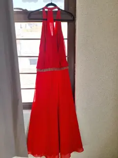 Vestido rojo con abertura en la pierna y espalda descubierta con tira en medio, talla 8 Marca Eva BRazzi, una sola puesta.